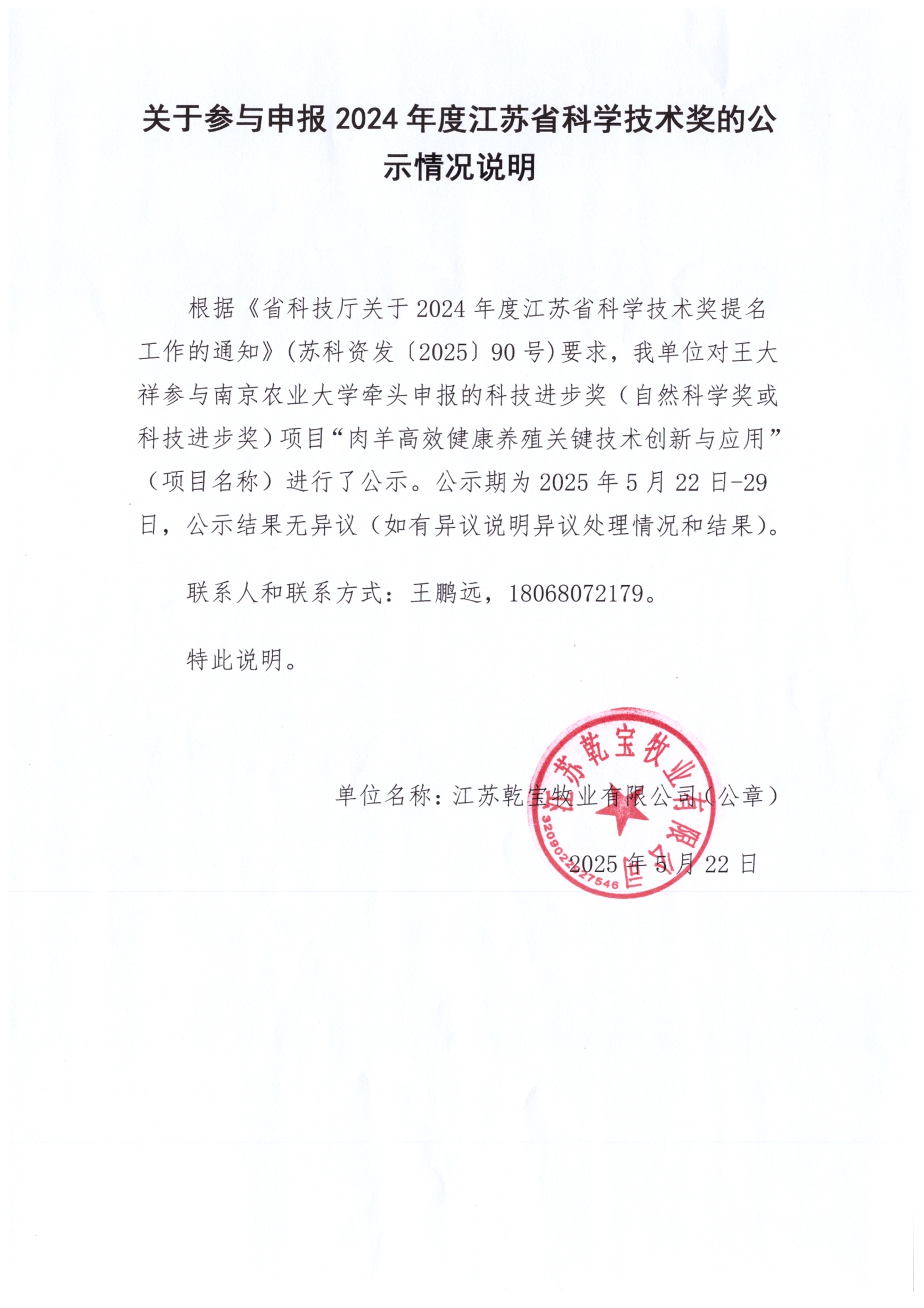 關于參與申報2024年度江蘇省科學技術獎的公示